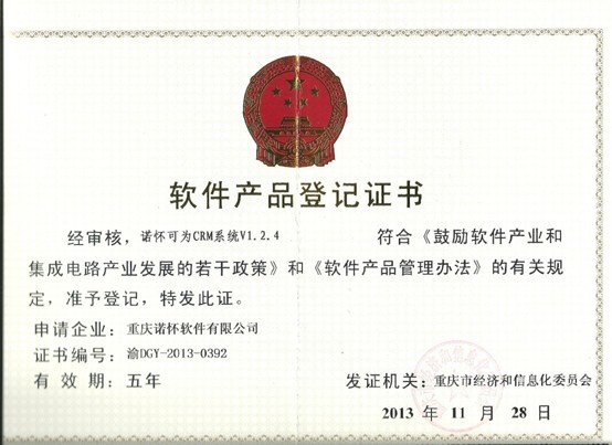 2013年11月,諾懷自主研發(fā)的“可為CRM系統(tǒng)”成功地通過了“工業(yè)和信息化部軟件產(chǎn)品登記”,正式成為了被國家認(rèn)可的軟件產(chǎn)品。