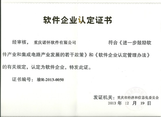 2013年12月,諾懷通過專家組的審核,被認(rèn)為符合國家有關(guān)軟件企業(yè)的規(guī)定,成功獲得了“工業(yè)和信息化部軟件企業(yè)認(rèn)定”證書。從此,諾懷軟件正式成為“雙軟企業(yè)”!