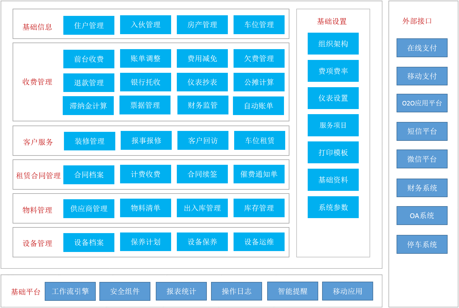 功能覆蓋了物業(yè)管理的四大領(lǐng)域:收費(fèi)管理、客戶服務(wù)、租賃管理、工程管理,有十三個(gè)功能模塊,285個(gè)功能點(diǎn)。為滿足不同的業(yè)務(wù)需求,